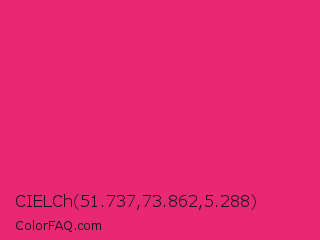 CIELCh 51.737,73.862,5.288 Color is a normal rose color and the nearest color is Razzmatazz #e3256b. Hex code #e82873 and RGB value is rgb(232,40,115). In RGB color space, this color is composed of 91% red, 16% green, 45% blue, In CMYK color space, this color is composed of 0% cyan, 83% magenta, 50% yellow , 9% black , In HSL color space, this color has a hue angle of 337° , 81% saturation and 53% lightness.