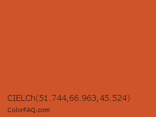 CIELCh 51.744,66.963,45.524 Color is a normal color and the nearest color is Piper #c96323. Hex code #d0542a and RGB value is rgb(208,84,42). In RGB color space, this color is composed of 82% red, 33% green, 16% blue, In CMYK color space, this color is composed of 0% cyan, 60% magenta, 80% yellow , 18% black , In HSL color space, this color has a hue angle of 15° , 66% saturation and 49% lightness.