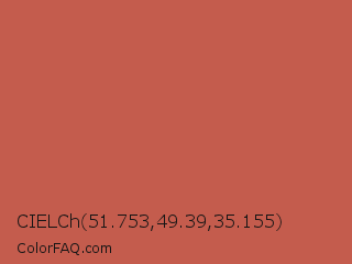 CIELCh 51.753,49.39,35.155 Color is a normal red color and the nearest color is Cedar Chest #c95a49. Hex code #c45c4d and RGB value is rgb(196,92,77). In RGB color space, this color is composed of 77% red, 36% green, 30% blue, In CMYK color space, this color is composed of 0% cyan, 53% magenta, 61% yellow , 23% black , In HSL color space, this color has a hue angle of 8° , 50% saturation and 54% lightness.
