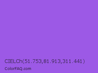 CIELCh 51.753,81.913,311.441 Color is a light violet color and the nearest color is Navy Purple #9457eb. Hex code #9c59e6 and RGB value is rgb(156,89,230). In RGB color space, this color is composed of 61% red, 35% green, 90% blue, In CMYK color space, this color is composed of 32% cyan, 61% magenta, 0% yellow , 10% black , In HSL color space, this color has a hue angle of 269° , 74% saturation and 63% lightness.