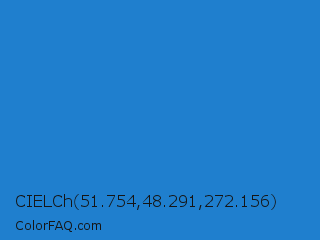 CIELCh 51.754,48.291,272.156 Color is a normal blue color and the nearest color is Bright Navy Blue #1974d2. Hex code #1f7fce and RGB value is rgb(31,127,206). In RGB color space, this color is composed of 12% red, 50% green, 81% blue, In CMYK color space, this color is composed of 85% cyan, 38% magenta, 0% yellow , 19% black , In HSL color space, this color has a hue angle of 207° , 74% saturation and 46% lightness.