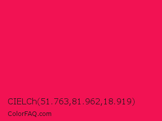 CIELCh 51.763,81.962,18.919 Color is a normal rose color and the nearest color is Red Crayola #ee204d. Hex code #f21253 and RGB value is rgb(242,18,83). In RGB color space, this color is composed of 95% red, 7% green, 33% blue, In CMYK color space, this color is composed of 0% cyan, 93% magenta, 66% yellow , 5% black , In HSL color space, this color has a hue angle of 343° , 90% saturation and 51% lightness.