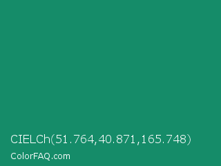 CIELCh 51.764,40.871,165.748 Color is a normal green color and the nearest color is Elf Green #088370. Hex code #158c69 and RGB value is rgb(21,140,105). In RGB color space, this color is composed of 8% red, 55% green, 41% blue, In CMYK color space, this color is composed of 85% cyan, 0% magenta, 25% yellow , 45% black , In HSL color space, this color has a hue angle of 162° , 74% saturation and 32% lightness.