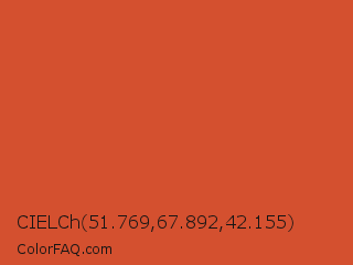 CIELCh 51.769,67.892,42.155 Color is a normal red color and the nearest color is Valencia #d84437. Hex code #d4502f and RGB value is rgb(212,80,47). In RGB color space, this color is composed of 83% red, 31% green, 18% blue, In CMYK color space, this color is composed of 0% cyan, 62% magenta, 78% yellow , 17% black , In HSL color space, this color has a hue angle of 12° , 66% saturation and 51% lightness.