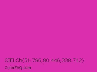 CIELCh 51.786,80.446,338.712 Color is a normal magenta color and the nearest color is Frostbite #e936a7. Hex code #da2eaf and RGB value is rgb(218,46,175). In RGB color space, this color is composed of 85% red, 18% green, 69% blue, In CMYK color space, this color is composed of 0% cyan, 79% magenta, 20% yellow , 15% black , In HSL color space, this color has a hue angle of 315° , 70% saturation and 52% lightness.