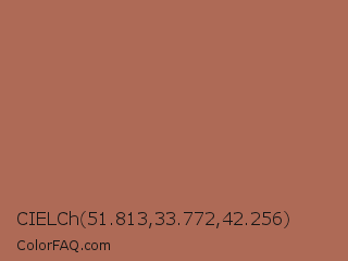 CIELCh 51.813,33.772,42.256 Color is a normal red color and the nearest color is Santa Fe #b16d52. Hex code #ae6a56 and RGB value is rgb(174,106,86). In RGB color space, this color is composed of 68% red, 42% green, 34% blue, In CMYK color space, this color is composed of 0% cyan, 39% magenta, 51% yellow , 32% black , In HSL color space, this color has a hue angle of 14° , 35% saturation and 51% lightness.