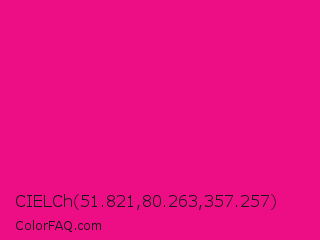 CIELCh 51.821,80.263,357.257 Color is a normal rose color and the nearest color is Mexican Pink #e4007c. Hex code #ed0d85 and RGB value is rgb(237,13,133). In RGB color space, this color is composed of 93% red, 5% green, 52% blue, In CMYK color space, this color is composed of 0% cyan, 95% magenta, 44% yellow , 7% black , In HSL color space, this color has a hue angle of 328° , 90% saturation and 49% lightness.