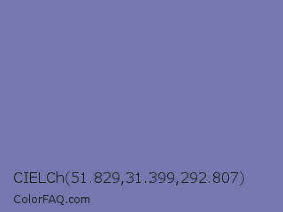 CIELCh 51.829,31.399,292.807 Color is a normal blue color and the nearest color is Kimberly #736c9f. Hex code #7577ad and RGB value is rgb(117,119,173). In RGB color space, this color is composed of 46% red, 47% green, 68% blue, In CMYK color space, this color is composed of 32% cyan, 31% magenta, 0% yellow , 32% black , In HSL color space, this color has a hue angle of 238° , 25% saturation and 57% lightness.