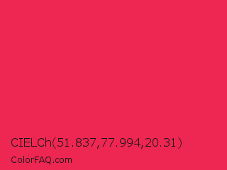 CIELCh 51.837,77.994,20.31 Color is a normal red color and the nearest color is Red Crayola #ee204d. Hex code #ed2652 and RGB value is rgb(237,38,82). In RGB color space, this color is composed of 93% red, 15% green, 32% blue, In CMYK color space, this color is composed of 0% cyan, 84% magenta, 65% yellow , 7% black , In HSL color space, this color has a hue angle of 347° , 85% saturation and 54% lightness.