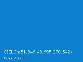 CIELCh 51.846,48.695,270.542 Color is a normal blue color and the nearest color is Lochmara #007ec7. Hex code #0a80cf and RGB value is rgb(10,128,207). In RGB color space, this color is composed of 4% red, 50% green, 81% blue, In CMYK color space, this color is composed of 95% cyan, 38% magenta, 0% yellow , 19% black , In HSL color space, this color has a hue angle of 204° , 91% saturation and 43% lightness.