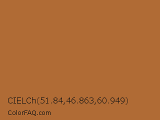 CIELCh 51.84,46.863,60.949 Color is a normal orange color and the nearest color is Copper #b87333. Hex code #b06b35 and RGB value is rgb(176,107,53). In RGB color space, this color is composed of 69% red, 42% green, 21% blue, In CMYK color space, this color is composed of 0% cyan, 39% magenta, 70% yellow , 31% black , In HSL color space, this color has a hue angle of 26° , 54% saturation and 45% lightness.