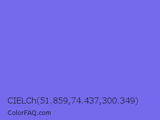 CIELCh 51.859,74.437,300.349 Color is a light indigo color and the nearest color is Medium Slate Blue #7b68ee. Hex code #746aeb and RGB value is rgb(116,106,235). In RGB color space, this color is composed of 45% red, 42% green, 92% blue, In CMYK color space, this color is composed of 51% cyan, 55% magenta, 0% yellow , 8% black , In HSL color space, this color has a hue angle of 245° , 76% saturation and 67% lightness.