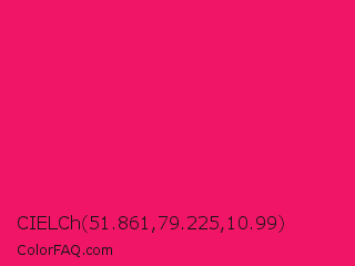 CIELCh 51.861,79.225,10.99 Color is a normal rose color and the nearest color is Ruby #e0115f. Hex code #f01566 and RGB value is rgb(240,21,102). In RGB color space, this color is composed of 94% red, 8% green, 40% blue, In CMYK color space, this color is composed of 0% cyan, 91% magenta, 58% yellow , 6% black , In HSL color space, this color has a hue angle of 338° , 88% saturation and 51% lightness.