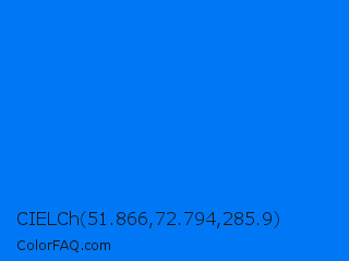 CIELCh 51.866,72.794,285.9 Color is a normal blue color and the nearest color is Azure Radiance #007fff. Hex code #0078f5 and RGB value is rgb(0,120,245). In RGB color space, this color is composed of 0% red, 47% green, 96% blue, In CMYK color space, this color is composed of 100% cyan, 51% magenta, 0% yellow , 4% black , In HSL color space, this color has a hue angle of 211° , 100% saturation and 48% lightness.