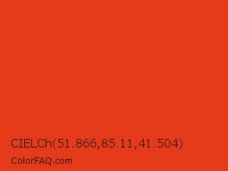 CIELCh 51.866,85.11,41.504 Color is a normal red color and the nearest color is Vermilion #d9381e. Hex code #e63b1a and RGB value is rgb(230,59,26). In RGB color space, this color is composed of 90% red, 23% green, 10% blue, In CMYK color space, this color is composed of 0% cyan, 74% magenta, 89% yellow , 10% black , In HSL color space, this color has a hue angle of 10° , 80% saturation and 50% lightness.