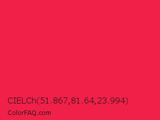 CIELCh 51.867,81.64,23.994 Color is a normal red color and the nearest color is Red Crayola #ee204d. Hex code #f02048 and RGB value is rgb(240,32,72). In RGB color space, this color is composed of 94% red, 13% green, 28% blue, In CMYK color space, this color is composed of 0% cyan, 87% magenta, 70% yellow , 6% black , In HSL color space, this color has a hue angle of 348° , 87% saturation and 53% lightness.