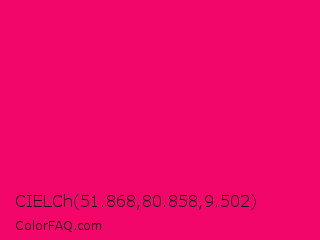 CIELCh 51.868,80.858,9.502 Color is a normal rose color and the nearest color is Vivid Raspberry #ff006c. Hex code #f20669 and RGB value is rgb(242,6,105). In RGB color space, this color is composed of 95% red, 2% green, 41% blue, In CMYK color space, this color is composed of 0% cyan, 98% magenta, 57% yellow , 5% black , In HSL color space, this color has a hue angle of 335° , 95% saturation and 49% lightness.