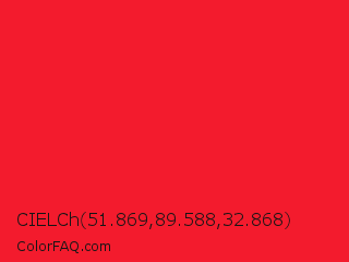 CIELCh 51.869,89.588,32.868 Color is a normal red color and the nearest color is Red Pigment #ed1c24. Hex code #f31b2d and RGB value is rgb(243,27,45). In RGB color space, this color is composed of 95% red, 11% green, 18% blue, In CMYK color space, this color is composed of 0% cyan, 89% magenta, 81% yellow , 5% black , In HSL color space, this color has a hue angle of 355° , 90% saturation and 53% lightness.