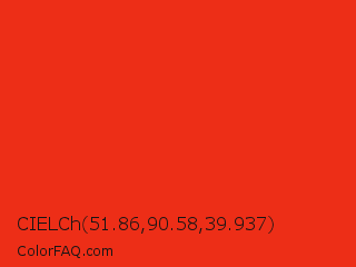 CIELCh 51.86,90.58,39.937 Color is a normal red color and the nearest color is Lust #e62020. Hex code #ed2e17 and RGB value is rgb(237,46,23). In RGB color space, this color is composed of 93% red, 18% green, 9% blue, In CMYK color space, this color is composed of 0% cyan, 81% magenta, 90% yellow , 7% black , In HSL color space, this color has a hue angle of 6° , 86% saturation and 51% lightness.