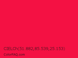CIELCh 51.882,85.539,25.153 Color is a normal red color and the nearest color is Red Ribbon #ed0a3f. Hex code #f41143 and RGB value is rgb(244,17,67). In RGB color space, this color is composed of 96% red, 7% green, 26% blue, In CMYK color space, this color is composed of 0% cyan, 93% magenta, 73% yellow , 4% black , In HSL color space, this color has a hue angle of 347° , 91% saturation and 51% lightness.