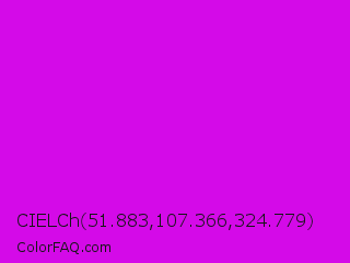 CIELCh 51.883,107.366,324.779 Color is a normal magenta color and the nearest color is Vivid Orchid #cc00ff. Hex code #d40ae8 and RGB value is rgb(212,10,232). In RGB color space, this color is composed of 83% red, 4% green, 91% blue, In CMYK color space, this color is composed of 9% cyan, 96% magenta, 0% yellow , 9% black , In HSL color space, this color has a hue angle of 295° , 92% saturation and 47% lightness.