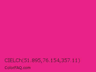 CIELCh 51.895,76.154,357.11 Color is a normal rose color and the nearest color is Barbie Pink #e0218a. Hex code #e82385 and RGB value is rgb(232,35,133). In RGB color space, this color is composed of 91% red, 14% green, 52% blue, In CMYK color space, this color is composed of 0% cyan, 85% magenta, 43% yellow , 9% black , In HSL color space, this color has a hue angle of 330° , 81% saturation and 52% lightness.