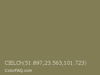 CIELCh 51.897,23.563,101.723 Color is a normal yellow color and the nearest color is Gold Fusion #85754e. Hex code #827d54 and RGB value is rgb(130,125,84). In RGB color space, this color is composed of 51% red, 49% green, 33% blue, In CMYK color space, this color is composed of 0% cyan, 4% magenta, 35% yellow , 49% black , In HSL color space, this color has a hue angle of 53° , 21% saturation and 42% lightness.