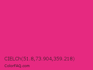 CIELCh 51.8,73.904,359.218 Color is a normal rose color and the nearest color is Barbie Pink #e0218a. Hex code #e62980 and RGB value is rgb(230,41,128). In RGB color space, this color is composed of 90% red, 16% green, 50% blue, In CMYK color space, this color is composed of 0% cyan, 82% magenta, 44% yellow , 10% black , In HSL color space, this color has a hue angle of 332° , 79% saturation and 53% lightness.