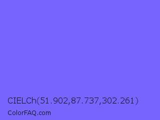 CIELCh 51.902,87.737,302.261 Color is a light indigo color and the nearest color is Very Light Blue #6666ff. Hex code #7664fd and RGB value is rgb(118,100,253). In RGB color space, this color is composed of 46% red, 39% green, 99% blue, In CMYK color space, this color is composed of 53% cyan, 60% magenta, 0% yellow , 1% black , In HSL color space, this color has a hue angle of 247° , 97% saturation and 69% lightness.