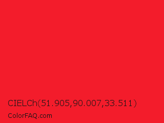 CIELCh 51.905,90.007,33.511 Color is a normal red color and the nearest color is Red Pigment #ed1c24. Hex code #f31c2b and RGB value is rgb(243,28,43). In RGB color space, this color is composed of 95% red, 11% green, 17% blue, In CMYK color space, this color is composed of 0% cyan, 88% magenta, 82% yellow , 5% black , In HSL color space, this color has a hue angle of 356° , 90% saturation and 53% lightness.