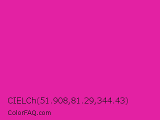 CIELCh 51.908,81.29,344.43 Color is a normal magenta color and the nearest color is Frostbite #e936a7. Hex code #e321a3 and RGB value is rgb(227,33,163). In RGB color space, this color is composed of 89% red, 13% green, 64% blue, In CMYK color space, this color is composed of 0% cyan, 85% magenta, 28% yellow , 11% black , In HSL color space, this color has a hue angle of 320° , 78% saturation and 51% lightness.