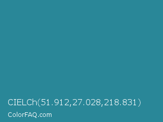 CIELCh 51.912,27.028,218.831 Color is a normal cyan color and the nearest color is Jelly Bean #297b9a. Hex code #298798 and RGB value is rgb(41,135,152). In RGB color space, this color is composed of 16% red, 53% green, 60% blue, In CMYK color space, this color is composed of 73% cyan, 11% magenta, 0% yellow , 40% black , In HSL color space, this color has a hue angle of 189° , 58% saturation and 38% lightness.