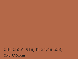CIELCh 51.918,41.34,48.558 Color is a normal orange color and the nearest color is Brown Sugar #af6e4d. Hex code #b46848 and RGB value is rgb(180,104,72). In RGB color space, this color is composed of 71% red, 41% green, 28% blue, In CMYK color space, this color is composed of 0% cyan, 42% magenta, 60% yellow , 29% black , In HSL color space, this color has a hue angle of 18° , 43% saturation and 49% lightness.