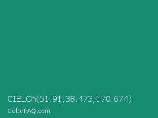 CIELCh 51.91,38.473,170.674 Color is a normal cyan color and the nearest color is Elf Green #088370. Hex code #138c70 and RGB value is rgb(19,140,112). In RGB color space, this color is composed of 7% red, 55% green, 44% blue, In CMYK color space, this color is composed of 86% cyan, 0% magenta, 20% yellow , 45% black , In HSL color space, this color has a hue angle of 166° , 76% saturation and 31% lightness.