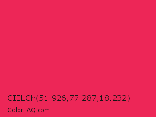 CIELCh 51.926,77.287,18.232 Color is a normal red color and the nearest color is Red Crayola #ee204d. Hex code #ed2657 and RGB value is rgb(237,38,87). In RGB color space, this color is composed of 93% red, 15% green, 34% blue, In CMYK color space, this color is composed of 0% cyan, 84% magenta, 63% yellow , 7% black , In HSL color space, this color has a hue angle of 345° , 85% saturation and 54% lightness.