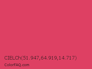 CIELCh 51.947,64.919,14.717 Color is a normal red color and the nearest color is Paradise Pink #e63e62. Hex code #de4063 and RGB value is rgb(222,64,99). In RGB color space, this color is composed of 87% red, 25% green, 39% blue, In CMYK color space, this color is composed of 0% cyan, 71% magenta, 55% yellow , 13% black , In HSL color space, this color has a hue angle of 347° , 71% saturation and 56% lightness.