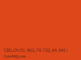 CIELCh 51.962,79.732,44.441 Color is a normal red color and the nearest color is Vermilion #d9381e. Hex code #de471a and RGB value is rgb(222,71,26). In RGB color space, this color is composed of 87% red, 28% green, 10% blue, In CMYK color space, this color is composed of 0% cyan, 68% magenta, 88% yellow , 13% black , In HSL color space, this color has a hue angle of 14° , 79% saturation and 49% lightness.