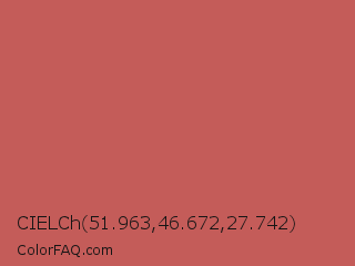 CIELCh 51.963,46.672,27.742 Color is a normal red color and the nearest color is Fuzzy Wuzzy Brown #c45655. Hex code #c45c59 and RGB value is rgb(196,92,89). In RGB color space, this color is composed of 77% red, 36% green, 35% blue, In CMYK color space, this color is composed of 0% cyan, 53% magenta, 55% yellow , 23% black , In HSL color space, this color has a hue angle of 2° , 48% saturation and 56% lightness.