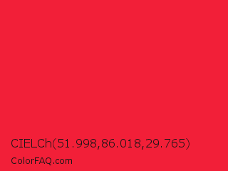 CIELCh 51.998,86.018,29.765 Color is a normal red color and the nearest color is Imperial Red #ed2939. Hex code #f21f38 and RGB value is rgb(242,31,56). In RGB color space, this color is composed of 95% red, 12% green, 22% blue, In CMYK color space, this color is composed of 0% cyan, 87% magenta, 77% yellow , 5% black , In HSL color space, this color has a hue angle of 353° , 89% saturation and 54% lightness.