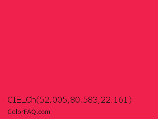CIELCh 52.005,80.583,22.161 Color is a normal red color and the nearest color is Red Crayola #ee204d. Hex code #f0214d and RGB value is rgb(240,33,77). In RGB color space, this color is composed of 94% red, 13% green, 30% blue, In CMYK color space, this color is composed of 0% cyan, 86% magenta, 68% yellow , 6% black , In HSL color space, this color has a hue angle of 347° , 87% saturation and 54% lightness.