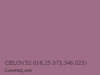 CIELCh 52.018,25.073,346.023 Color is a normal rose color and the nearest color is Strikemaster #956387. Hex code #a06d87 and RGB value is rgb(160,109,135). In RGB color space, this color is composed of 63% red, 43% green, 53% blue, In CMYK color space, this color is composed of 0% cyan, 32% magenta, 16% yellow , 37% black , In HSL color space, this color has a hue angle of 329° , 21% saturation and 53% lightness.