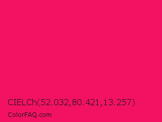 CIELCh 52.032,80.421,13.257 Color is a normal rose color and the nearest color is Raspberry #e30b5d. Hex code #f21261 and RGB value is rgb(242,18,97). In RGB color space, this color is composed of 95% red, 7% green, 38% blue, In CMYK color space, this color is composed of 0% cyan, 93% magenta, 60% yellow , 5% black , In HSL color space, this color has a hue angle of 339° , 90% saturation and 51% lightness.