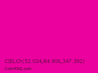 CIELCh 52.034,84.906,347.392 Color is a normal magenta color and the nearest color is Hollywood Cerise #f400a1. Hex code #eb029e and RGB value is rgb(235,2,158). In RGB color space, this color is composed of 92% red, 1% green, 62% blue, In CMYK color space, this color is composed of 0% cyan, 99% magenta, 33% yellow , 8% black , In HSL color space, this color has a hue angle of 320° , 98% saturation and 46% lightness.