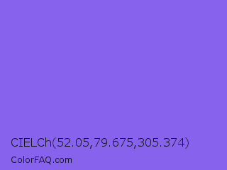 CIELCh 52.05,79.675,305.374 Color is a light indigo color and the nearest color is Medium Slate Blue #7b68ee. Hex code #8763ed and RGB value is rgb(135,99,237). In RGB color space, this color is composed of 53% red, 39% green, 93% blue, In CMYK color space, this color is composed of 43% cyan, 58% magenta, 0% yellow , 7% black , In HSL color space, this color has a hue angle of 256° , 79% saturation and 66% lightness.
