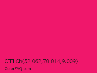 CIELCh 52.062,78.814,9.009 Color is a normal rose color and the nearest color is Razzmatazz #e3256b. Hex code #f0176b and RGB value is rgb(240,23,107). In RGB color space, this color is composed of 94% red, 9% green, 42% blue, In CMYK color space, this color is composed of 0% cyan, 90% magenta, 55% yellow , 6% black , In HSL color space, this color has a hue angle of 337° , 88% saturation and 52% lightness.