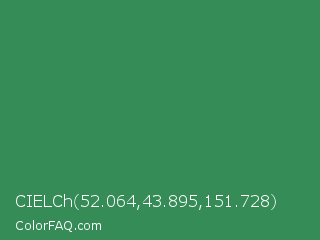 CIELCh 52.064,43.895,151.728 Color is a normal green color and the nearest color is Sea Green #2e8b57. Hex code #358c57 and RGB value is rgb(53,140,87). In RGB color space, this color is composed of 21% red, 55% green, 34% blue, In CMYK color space, this color is composed of 62% cyan, 0% magenta, 38% yellow , 45% black , In HSL color space, this color has a hue angle of 143° , 45% saturation and 38% lightness.