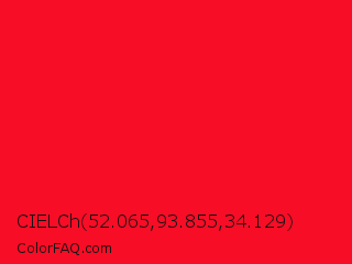 CIELCh 52.065,93.855,34.129 Color is a normal red color and the nearest color is Vivid Red #f70d1a. Hex code #f70d26 and RGB value is rgb(247,13,38). In RGB color space, this color is composed of 97% red, 5% green, 15% blue, In CMYK color space, this color is composed of 0% cyan, 95% magenta, 85% yellow , 3% black , In HSL color space, this color has a hue angle of 354° , 94% saturation and 51% lightness.