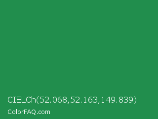 CIELCh 52.068,52.163,149.839 Color is a normal green color and the nearest color is Eucalyptus #278a5b. Hex code #218e4d and RGB value is rgb(33,142,77). In RGB color space, this color is composed of 13% red, 56% green, 30% blue, In CMYK color space, this color is composed of 77% cyan, 0% magenta, 46% yellow , 44% black , In HSL color space, this color has a hue angle of 144° , 62% saturation and 34% lightness.