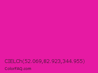 CIELCh 52.069,82.923,344.955 Color is a normal magenta color and the nearest color is Barbie Pink #e0218a. Hex code #e61aa3 and RGB value is rgb(230,26,163). In RGB color space, this color is composed of 90% red, 10% green, 64% blue, In CMYK color space, this color is composed of 0% cyan, 89% magenta, 29% yellow , 10% black , In HSL color space, this color has a hue angle of 320° , 80% saturation and 50% lightness.