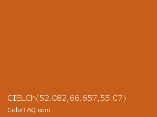 CIELCh 52.082,66.657,55.07 Color is a normal orange color and the nearest color is Orange Roughy #c45719. Hex code #c75e19 and RGB value is rgb(199,94,25). In RGB color space, this color is composed of 78% red, 37% green, 10% blue, In CMYK color space, this color is composed of 0% cyan, 53% magenta, 87% yellow , 22% black , In HSL color space, this color has a hue angle of 24° , 78% saturation and 44% lightness.